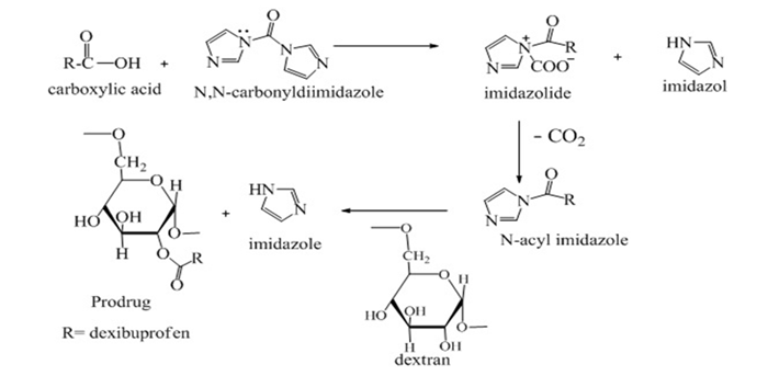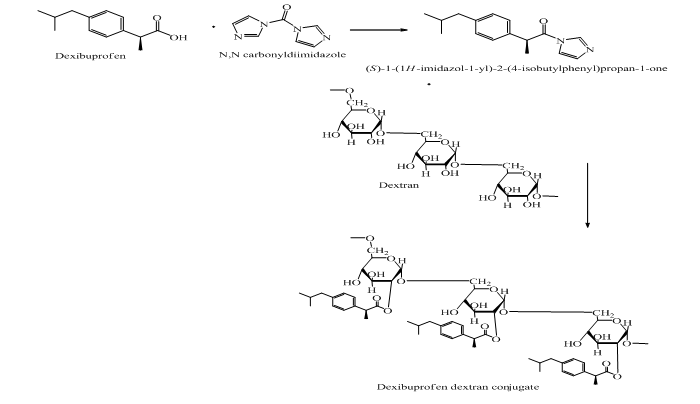 Dexibuprofen, the active enantiomeric fraction of ibuprofen contains carboxylic acid functional group and is principally responsible for irreversible binding with gastric mucosal lining on oral use and hence leads to ulceration (Ehrlich, 2000 ). Therefore, the research was focused on masking carboxylic acid group of dexibuprofen by esterification with dextran, a bioerodable polysaccharide to produce a novel and safe prodrug of dexibuprofen (Rautio et al., 2008