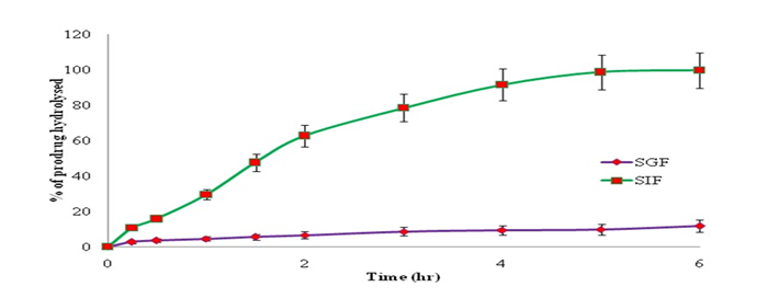 Hydrolysis of dexibuprofen prodrug in SGF produced 11.64% of dexibuprofen whereas hydrolysis in SIF was resulted with 99.53%. Prodrug did not show significant hydrolysis in SGF owing to its higher stability in acidic medium. Dexibuprofen prodrug was hydrolysed rapidly in SIF by following first-order kinetics with half-life as 85.9 min as displayed in Figure 3.