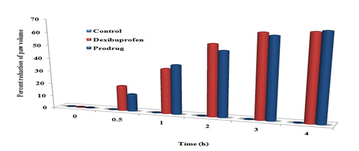 Experimental animals were divided into three groups of six each. Group I received sodium carboxy methylcellulose (0.5%), group II and III received dexibupropen (100 mg/kg) and prodrug 100 mg/kg respectively. Prior to administration, the volume of right hind paw edema of each animal was measured by digital plethysmometer. After 30 min of dosing, carrageenan (0.1 ml, 1% w/v, phlogistic agent) was injected into the planter surface of right hind paw. Right hind paw volume of animals was measured at 0.5, 1, 2, 3 and 4 h intervals. Mean volume differentials were calculated to assess the anti-inflammatory potentials of dexibuprofen conjugate (Vandana et al., 2014 ).
