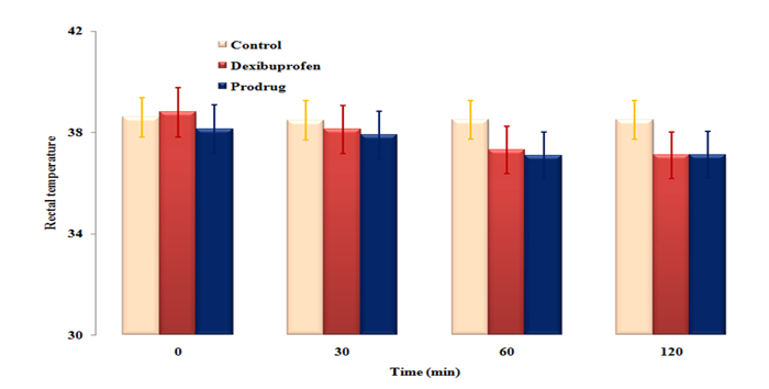 A dose of Brewer’s yeast (10 ml/kg) was injected subcutaneously below nape of animal to induce pyrexia. Groups-I, II and III received normal saline, dexibupropen (100 mg/kg) and prodrug (100 mg/kg) orally. Rectal temperatures of animals were recorded at 30, 60 and 120 min of post dosing (Hajare et al., 2000 ).