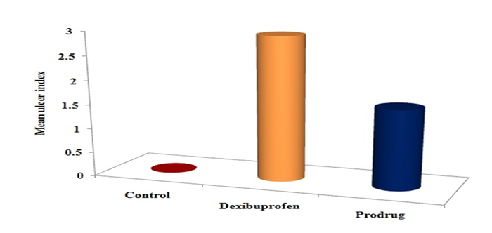 Experimental animal groups-I, II and III were treated with normal saline, dexibuprofen (100 mg/kg) and prodrug (equivalent to 100 mg of dexibuprofen) up to three days. Animals were fasted overnight after third day dosing and sacrificed by decapitation. Stomach segments were isolated and washed with physiological saline. The mucosal linings were microscopically examined for the lesions. Ulcer indices were calculated and severity of gastric lesions was scored as: normal stomach (0), red coloration (0.5), spot ulcer (1), hemorrhagic streak (1.5), ulcers (2), and perforation (3) (Vyas et al., 2009 ).