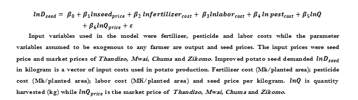 Farmer’s seed demand was derived from the assumption of production function. Improved potato seed varieties demand by farmers was specified using seed demand as a function of output quantity, input prices and costs. Using the input demand function derived above (equation 6), farmer’s seed demand function for the improved potato seed was given by: