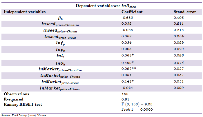 Ramsey RESET test was carried out to test the functional form of seed demand for Thandizo, Chuma, Mwai and Zikomo varieties. Ramsey RESET tests whether non-linear combinations of the fitted values help explain the response variable. The null hypothesis was that; the quadratic variables are not significant. From the P-value of 0.000 in table 1, we fail to reject the null hypothesis and conclude that the functional form specified is correct.