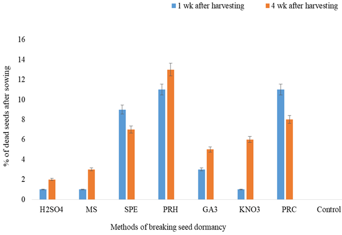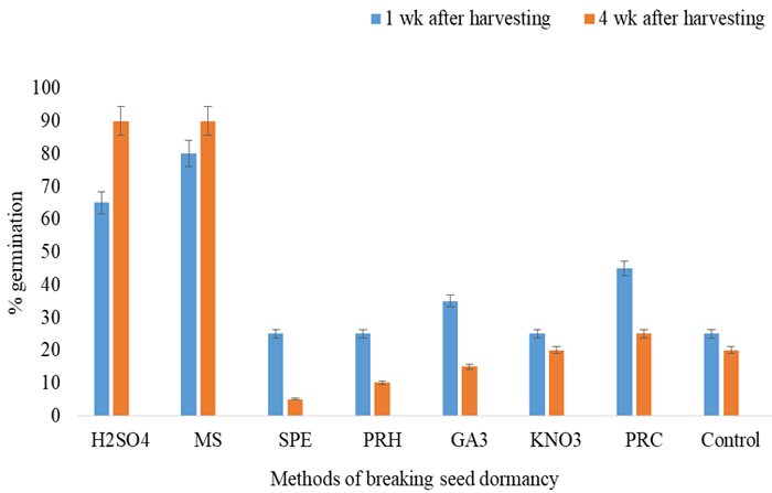 There was a significant difference among the seed dormancy breaking methods (P< 0.001) at both 1 and 4 weeks after seed harvesting Figure 2.