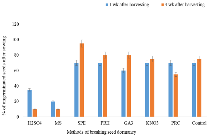 The highest (95 %) and least (10 %) ungerminated seeds were in the SPE and MS at 4 weeks after harvesting respectively.