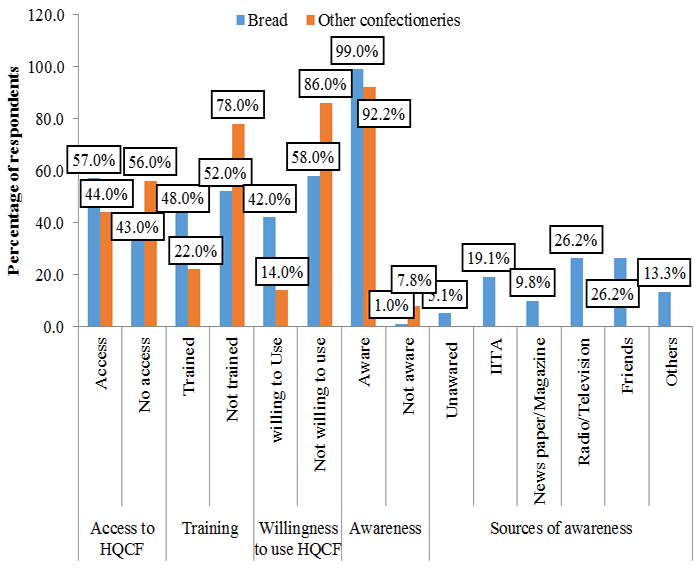 As a way of encouraging the use of composite flour, the need for training on how to use as well as creating selling points are very important. Figure 2 shows that 57.0% of the bread producers and 56.0% of other confectioneries producers had access to composite flour that contains HQCF while 48.0% and 22.0% of the bread producers and other confectioneries producers had training on the use of HQCF. The study revealed that only 42.0% of the bread producers and 14.0% of the other confectioneries producers were willing to use HQCF. This shows that most of the respondents were not willing to use composite flour.