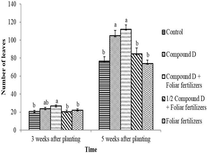 At 3 weeks after planting there was a significant (p<0.05) effect of foliar fertilizers on cowpea leaf number. Compound D + foliar fertilizers produced the highest number of leaves, whilst half compound D + foliar fertilizers and foliar fertilizers only were not statistically different. At 5 weeks there was a significant difference at (p<0.05), with compound D + foliar fertilizers having the highest number of leaves from half compound D + foliar fertilizers and foliar fertilizers only which were statistically similar to the control Figure 1.