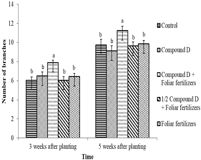 There was a significant (p<0.05) effect of foliar fertilizers on branch number at both 3 and 5 weeks after planting. Compound D + foliar fertilizers produced the highest number of branches at both 3 and 5 weeks after planting whilst other treatments were similar. At both 3 and 5 weeks after planting, half compound D + foliar fertilizers and foliar fertilizers only were statistically similar to the control Figure 2.