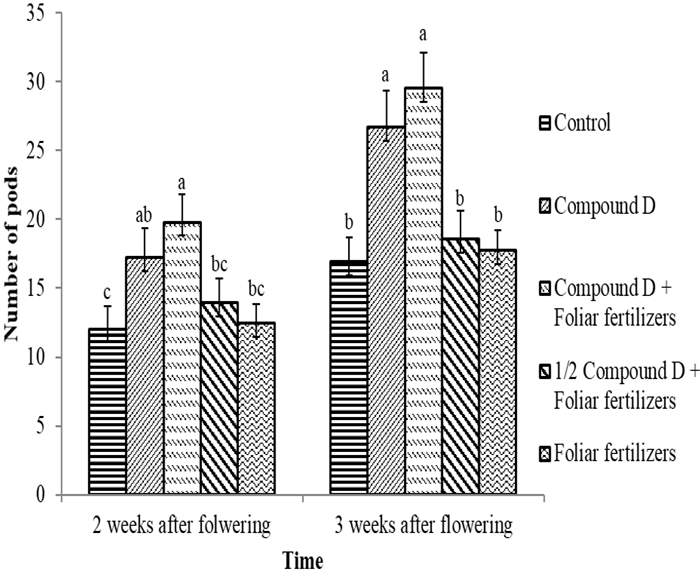 At 2 weeks after flowering, there was a significant (p<0.05) effect of foliar fertilizers on number of pods. Compound D + foliar fertilizers had the highest number of pods, but it was statistically similar to that of compound D. The control was not statistically different from half compound D + foliar fertilizers and foliar fertilizers only. At 3 weeks after flowering compound D + foliar fertilizers, compound D only were statistically similar but they were significantly different from halfcompound D + foliar fertilizers, foliar fertilizers only and the control Figure 3.