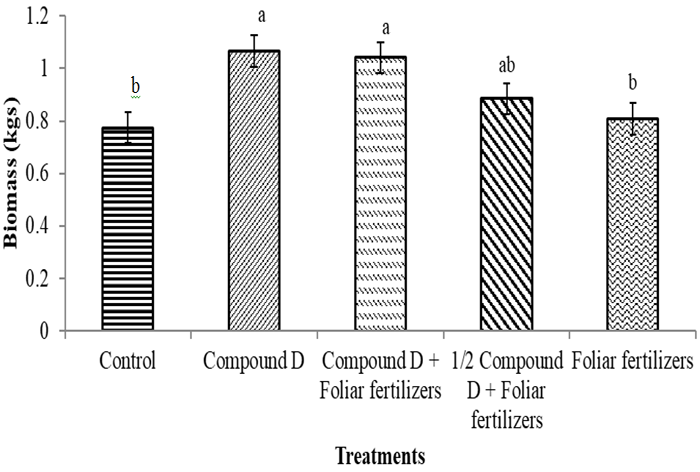 There was a significant (p<0.05) effect of foliar fertilizers on the dry biomass of cowpea. Compound D produced the highest dry biomass of 1kg, but it was not statistically different from compound D + foliar fertilizers and half compound D + foliar fertilizers. The lowest dry biomass was produced from the control plot and it was statistically similar to foliar fertilizers only Figure 4.