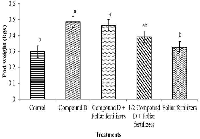 There was a significant (p<0.05) effect of foliar fertilizers on pod weight. Statistically, compound D, compound D + foliar fertilizers and half compound + foliar fertilizers were not different, with pod weight of the same range. Half compound D + foliar fertilizer and foliar fertilizers were both not significantly different from the control, thus making them similar Figure 5.