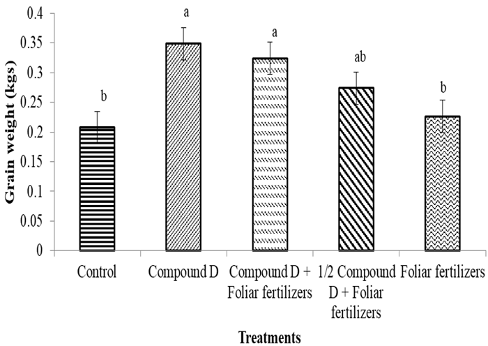 There was a significant (p<0.05) effect of foliar fertilizers on the grain weight of cowpea. Compound D only produced the highest yield, but it was not statistically different from compound D + foliar fertilizers and half compound D + foliar fertilizers. Though the control had the lowest yield, it was statistically similar to half compound D+ foliar fertilizers and foliar fertilizers only Figure 6.