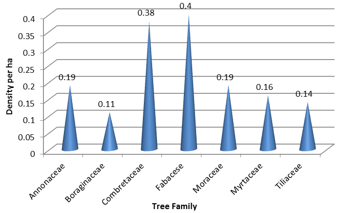 According to Table 2, regardless of their density ha-1, 19 different tree species were identified on the surveyed farm plots Table 2. About 34%, 19% and 49% of the tree species were found in villages of Senne, Fuafate and BHgL respectively. As shown in Table 1, there were also variations in the distribution of tree species among the surveyed villages. The tree species are also grouped under 7 families. According to Figure 2 and 3, these include the family of Annonaceae, Boraginaceae, Combretaceae, Fabaceae, Moraceae, Myrtaceae, and Tiliaceae. The result presented in Table 3 shows that there were 2.68 species ha-1 (STD = 1.86) for the surveyed farms as a whole. According to Table 1, the minimum and maximum number of tree species was 2 and 9 respectively. Similarly, according to Table 5 the average number of tree families was 1.57 ha-1 (STD = 1.42) for the surveyed farm plots.