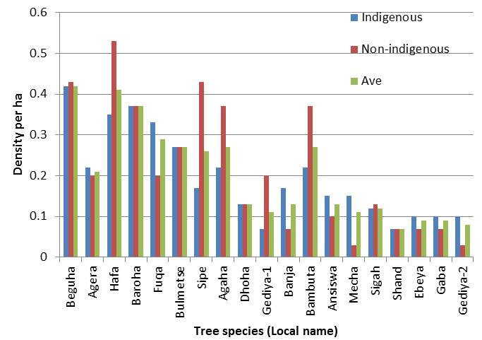 As shown in Table 1 On average, 3.82 trees per hectare (ha-1) were recorded in the greener belt of Ethiopia. The number of trees ha-1 ranges from 2 to14 (standard deviation (STD) = 3.26). About 30%, 21% and 49% of trees were found on the farm plots surveyed in Senne, Fuafate and BHgL villages respectively. The respective minimum and maximum numbers of trees ha-1 were 2 and 9 in Senne, 6 and 10 in Fuafate, and 5 and 14 in BHgL, village. The average number of trees ha-1 was 2.92 (STD = 2.42) in Senne, 3.94 (STD = 2.89) in Fuafate, and 4.67 (STD = 3.75) in BHgL, village.