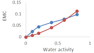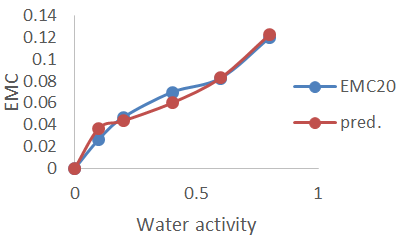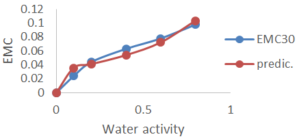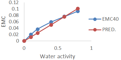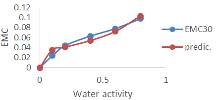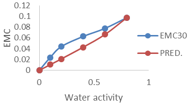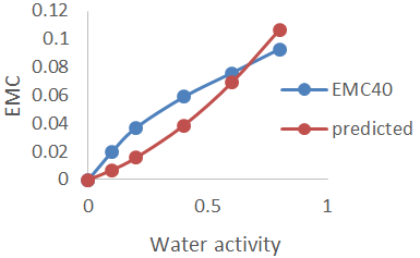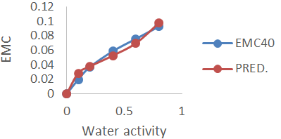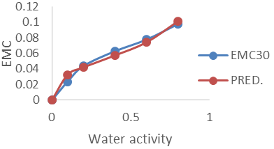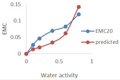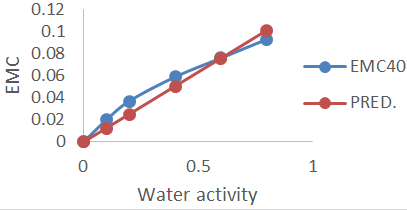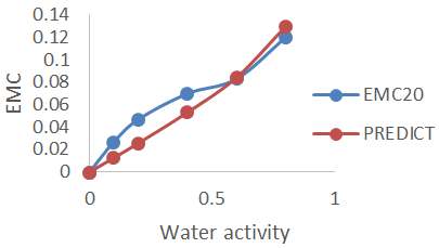 To validate the suitable model, the calculated EMC at different aw determined were used against the predicted at the same aw to plot the adsorption isotherms shown in Figures 2 to 19. The isotherms followed the characteristic type II (sigmoid shape) classification of Brunamer reported by Oyelade [18]. This is typical of isotherms of products high in starch content as observed by Onayemi and Oluwamukomi [23