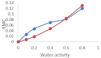 The equilibrium moisture content (EMC) was observed to be increasing with an increase in water activity (aw). This finding agrees with the generally observed trend that the higher the value of aw the more the quantity of adsorbed moisture. This corroborates the observation that at higher aw, more water is available for binding at the active site of the solid. Many researchers have reported isotherms which followed this principle in the literature [15-22] .