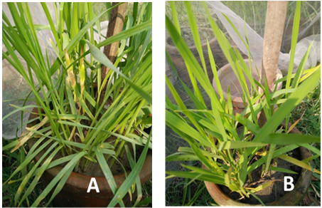 On the other hand, the wheat blast isolates J1, J2, R1 and R2 did not develop any blast symptom on the rice variety BRRI Dhan28 Table 1. It was found that wheat blast pathogen developed characteristic eye shape lesions on wheat leaves, junction of leaf blade and leaf sheath. Mostly symptoms observed in lower leaves, several lesions coalesced and developed larger lesion Figure 2. The results suggested that chromosomal constituent of wheat and rice blast pathogen may bears some differences, so they do not cause compatible reaction on wheat and rice plants. It was previously reported that the rice pathogen population was not the source for wheat blast, based on lack of cross-infectivity of rice and wheat isolates [8, 18
