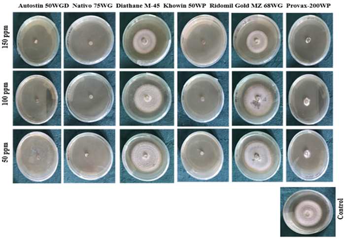 All six fungicides showed significant inhibitory effect on radial colony growth of M. oryzae Triticumon PDA plates at 50, 100 and 150 ppm concentration. The rate of inhibition varied with fungicides and their level of concentrations. Autostin 50WGD, Nativo 75WG and Khowin 50WP at 50, 100 and 150 ppm completely inhibited the mycelial growth of M. oryzae Triticum on PDA plate. Provax-200WP caused 66.58%, 71.29% and 80.44% inhibition of radial growth of at 50, 100 and 150 ppm, respectively. The reductions in radial colony diameter were 11.88, 17.32 and 27.72% under the treatment with Diathane M-45 at 50, 100 and 150 ppm concentration, respectively. Ridomil Gold MZ 68WG at three concentrations 50, 100 and 150 ppm gave 5.44, 8.91 and 33.66% reduction of radial growth, respectively Table 5, Figure 3. This result indicates that Autostin 50WGD (Carbandazim), Nativo 75WG (Teboconazole) and Khowin 50WP (Carbandazim) were most effective against M. oryzae Triticum gave good control of the pathogen. The result of this experiments supported the findings of Saharan, et al. [32