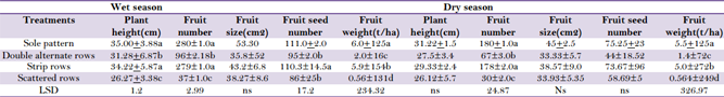 During the rainy season okra height values in sole pattern and its derivative strip pattern did not vary but were significantly higher than the other patterns. The same trend was also observed in pepper fruit number Table 3. The planting patterns had no significant effect on the pepper fruit size despite season. On pepper fruit seed number, during the rainy season both sole pattern (111.0,75.25) and strip rows pattern (110.3,73.67) were not significantly different but significantly higher than the other two planting patterns. Sole pattern fruit weight(6t/ha,5.5t/ha) was the highest while scattered pattern(0.5t/ha,0.56t/ha) was the least in both season.