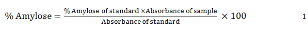 The method of Hoover and Ratnayake [22] was used. It is a colorimetric method in which amylose forms starch iodine complex (dark blue colour) due to its high affinity for iodine. About 0.1 g of the flour sample was solubilized with 1 ml of 95% ethanol and 9 ml of 1 N sodium hydroxide (NaOH), and heated in a boiling water bath for 10 min; 1 ml of the extract was made up to 10 ml with distilled water. To 0.5 ml of the diluted extract was added 0.1 ml I N acetic acid and 0.2 ml iodine solution (0.2 g Iodine+2.0 g KI in 100 ml of distilled water) to develop a dark blue colour. The coloured solution was made up to 10 ml with distilled water and allowed to stand for 20 min for complete colour development. The solution was vortexed and its absorbance was read on a spectrophotometer (Milton Roy Spectronic 601) at 620 nm. Absorbance of standard corn amylose with known amylose concentration was used to estimate the amylose content in the sample using Equation 1 as given below: