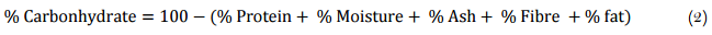 The carbohydrate content was determined using Equation 2, AOAC (Association of Official Analytical Chemists) [23