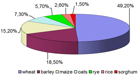 The figure shows that most often - 49.2% of the grain beetle is found on wheat grain, followed by barley - 18.5%, maize - 15.2% and on oats, rye, rice, and sorghum - 7.3%, 5.7%, 2.6% and 1.5%, respectively. We see that the frequency of occurrence in these stocks correlates with the degree of occurrence of these crops in the country's agriculture.