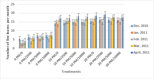 Unmanured sole plantain retained the least number of leaves from December 2010 to April 2011 Figure 1. Number of live leaves decreased as the volume of rainfall decreased from December 2010 to February 2011 and increased from March 2011 to April 2011. Plantain intercropped with watermelon and manure with 10 t ha-1 of poultry manure retained similar number of leaves as plantain intercropped with watermelon and manured with 20 t ha-1.