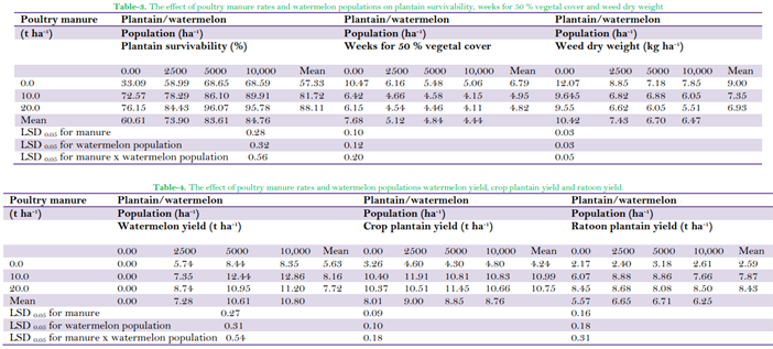 The increasing populations of watermelon and the application of poultry manure significantly reduced the number of weeks for 50 % vegetal cover Table 3. In the unmanured sole plantain plot, 50 % vegetal cover delayed for over 10 weeks after planting. Plantain manured with 20 t ha-1 and intercropped with 5000 stands ha-1 of watermelon had 50 % of the ground covered with vegetation in four weeks while sole plantain cultivated without manure achieved 50 % vegetal cover in ten weeks. There was no significant difference between plantain/watermelon intercrops manured with 10 t ha-1 and 20 t ha-1 of poultry manure.
