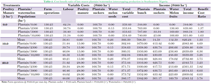 The difference in the input cost for the late season plantain/watermelon intercropping lied in the cost of weeding carried out Table 5. Plantain cultivated without watermelon intercrop had highest cost of weeding. Labour cost of weeding decreased as the watermelon stand ha-1 increased. Yield of plantain crop, ratoon and watermelon influenced the profit made from the sales and subsequently determined the benefit cost ratio obtained in each treatment. Plantain intercropped with 2500 stands ha-1 of watermelon and manured with 10 t ha-1 of poultry manure had highest benefit cost ratio (6.68) while unmanured sole plantain had least benefit cost ratio (0.51).