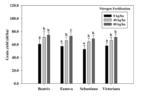 In all cultivars, the highest nitrogen level (80 kg/ha) resulted in the highest yield, though no statistically significant difference was seen between the two applied doses (40 and 80 kg/ha), apart from ‘Eunova’, where 80 kg/ha resulted in the significantly highest yield Figure 1. The cultivar ‘Beatrix’ showed highest yield for all fertilization levels, with 76.4, 73.1, and 62.3 dt/ha for 80, 40 and 0 kg/ha, respectively. In contrast, ‘Sebastiana’ had the lowest yield, with 70.7, 65.8, and 53.7 dt/ha respectively.