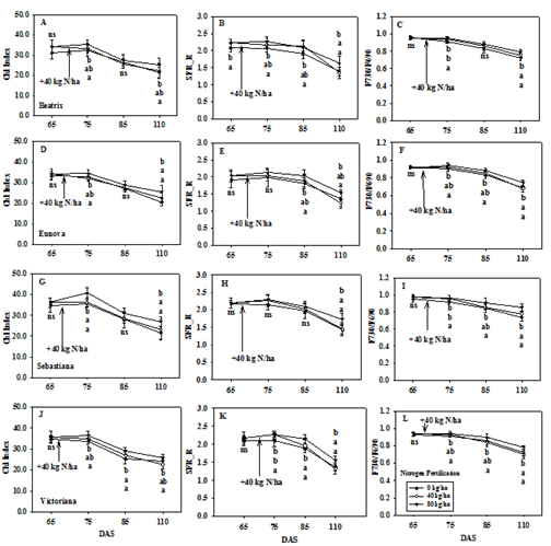 Figure-2. Chlorophyll indices on four evaluation dates (DAS 65, 75, 85 and 110) recorded via Dualex® (Chl Index), Multiplex® (SFR_R) and MiniVeg-N (F730/F690) of the barley cultivars Beatrix (A, B, C), Eunova, (D, E, F), Sebastiana (G, H, I) and Victoriana (J, K, L) fertilized with different nitrogen levels (0 kg/ha = closed circle; 40 kg/ha = open circle; 80 kg/ha = closed triangle). Means ± SE (n = 8 repetitions) followed by different letters indicate significant differences between treatments, ns indicates no significance (t-test and ANOVA, p ≤ 0.05) by Duncan Test.
