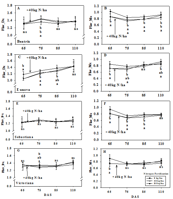 Figure-4. Flavonol indices recorded with the Dualex® (Flav_Dx and Multiplex®Flav_Mx) devices of the barley cultivars Beatrix (A, B), Eunova, (C; D), Sebastiana (E; F) and Victoriana (G; H) on four evaluation dates (DAS 65, 75, 85 and 110) and influenced by nitrogen fertilization levels (0 kg/ha = closed circle; 40 kg/ha = open circle; 80 kg/ha = closed triangle). Means ± SE (n = 8 repetitions) followed by different letters indicate significant differences between treatments, ns indicates no significance (t-test and ANOVA, p ≤ 0.05) by Duncan Test.