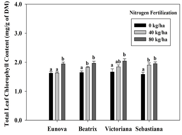 The laboratory analysis of chlorophyll content on 110 DAS showed significant differences between N fertilization treatments, with higher concentrations of the photosynthetic pigment for the highest applied dose (80 kg/ha), even though no statistically significance was portrayed between the two applied doses, apart from ‘Eunova’, where 40 kg/ha did not induce higher chlorophyll accumulation Figure 6. There was no significant difference between the evaluated cultivars.