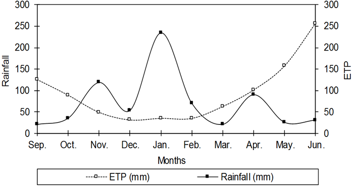 Climatic data (monthly rainfall, monthly means temperature, monthly evapotranspiration) relative to the growing season, were collected from a neighboring meteorological station Table 1.