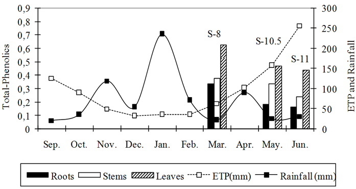 The three stages (S-8, S-10.5, S-11) when barley plants were collected for TP analysis were made during a water deficit period. The first collection was carried out on March 15 during a water deficit period of 42 mm. The second and the third collections were made during a more pronounced water deficit period, which were 132 and 226 mm, respectively Figure 1.