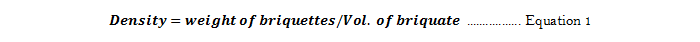 ) standard method of determining densities. Density was determined for each briquette as ratio of briquette weight to volume.